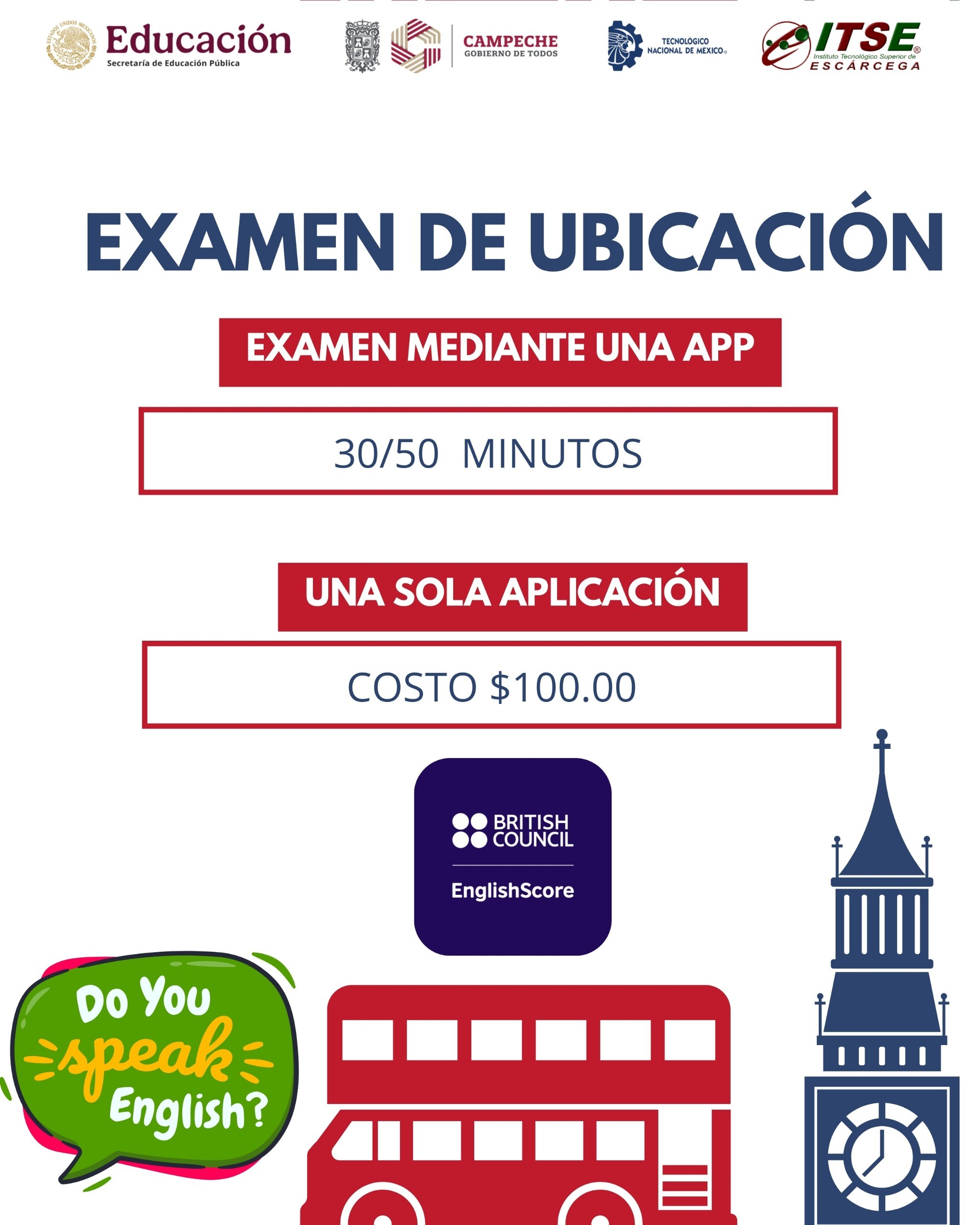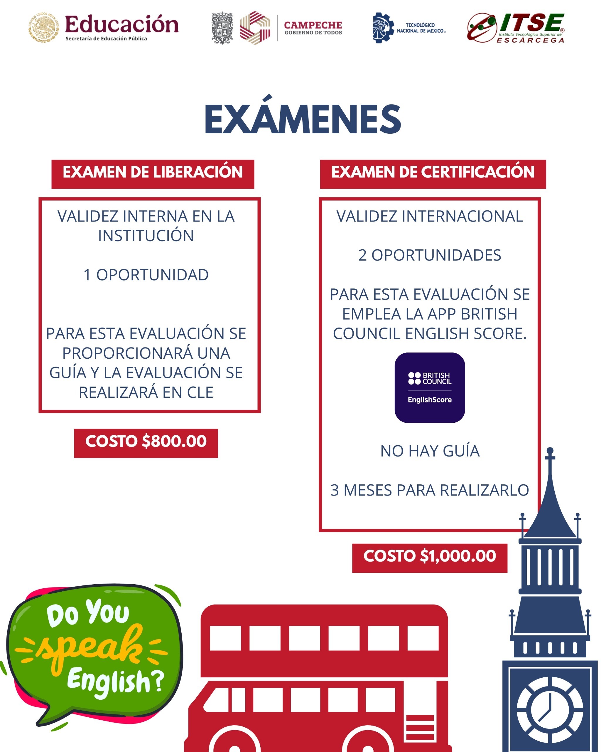Desde inicios del año 2024 el ITS Escárcega realizó un convenio con la editorial BRITISH COUNCIL para realizar certificaciones y el examen de ubicación de inglés del consulado británico, los cuales tienen validez internacional. Todo alumno perteneciente al ITS Escárcega tiene la obligación de obtener B1 de inglés (como mínimo) para así poder cumplir con uno de los requisitos de titulación. De igual forma, tiene la opción de obtener su comprobante de nivel de forma externa, siempre y cuando notifique con tiempo a la coordinación de lenguas extranjeras.